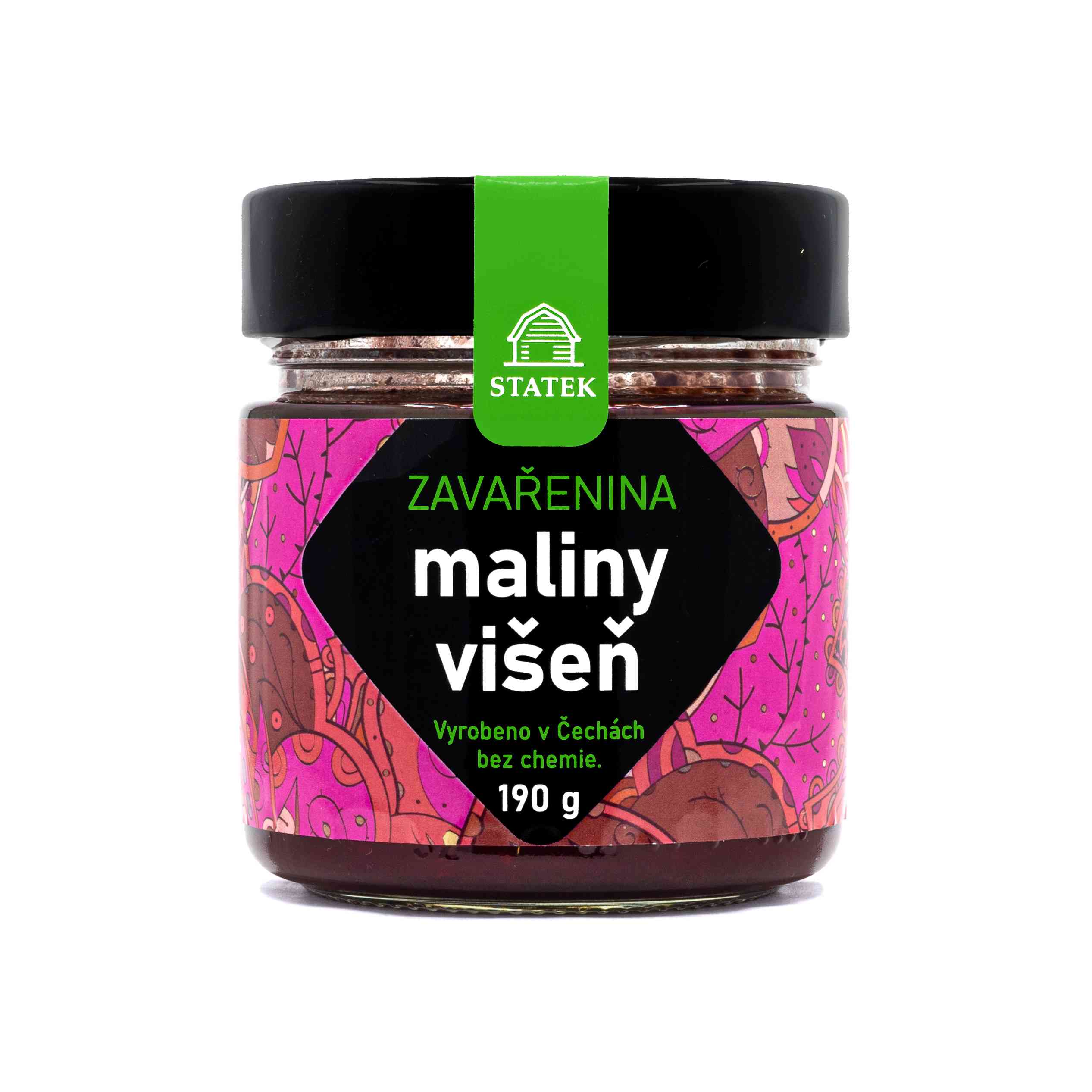 zavařenina z malina a višní - zpracované ovoce - zavařenina, výrobek k přímé konzumaci. Hmotnost 190 g. Složení: maliny min. 37%, višně min 37%, řepný cukr, citrusový pektin, levandule, muškátový oříšek. Skladujte mimo přímé slunce do 25 °C a po otevření v chladničce. Po otevření zkonzumujte do 14 dní. Výrobek je šetrně pasterován. Vyrobeno v ČR.